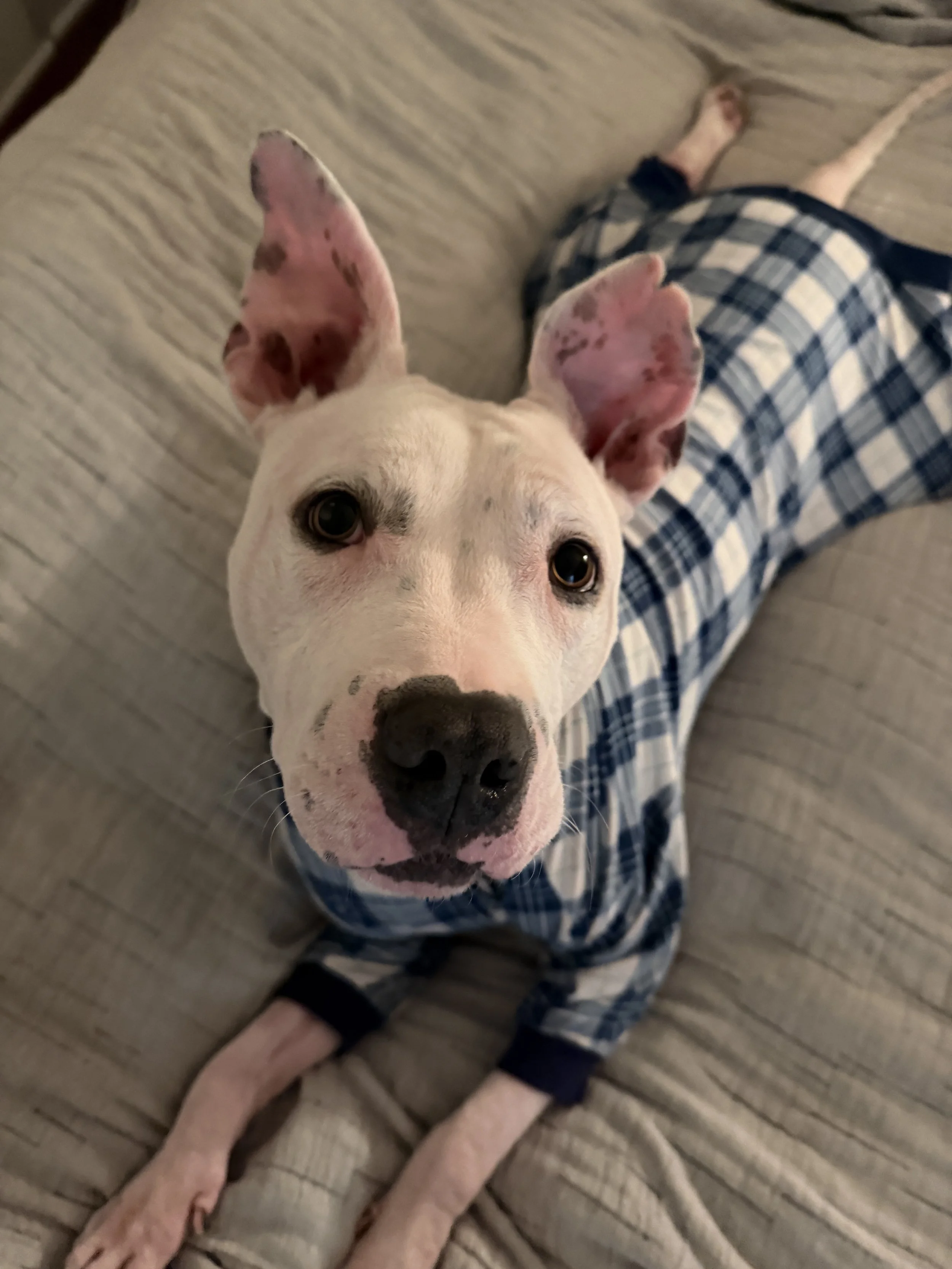 Pink was one massive ball of energy. She was obsessed with the ball and loved to play. She was hilarious. She loved to snuggle and hide under our bed covers. We rescued her from ALIVE Rescue. She passed on August 2025 from cancer. She is missed so much